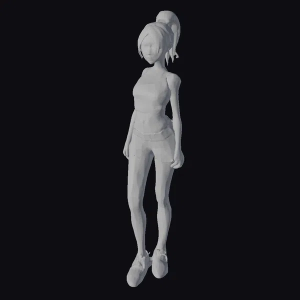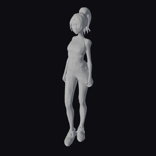 This 3D model captures a young woman in a relaxed, sporty outfit. She stands with her weight evenly distributed on both feet, her hands by her sides. Her brown hair is styled in a high ponytail, framing her face with a few loose strands. The pink sports bra and gray shorts create a casual, athletic look, complemented by white socks and silver trainers. Her facial features are detailed, with defined eyes and a subtle smile. The model’s proportions are well-defined, showcasing a fit and youthful appearance. This model is ideal for projects requiring a realistic human character in a casual setting, suitable for applications in games, animation, print media, and virtual reality.