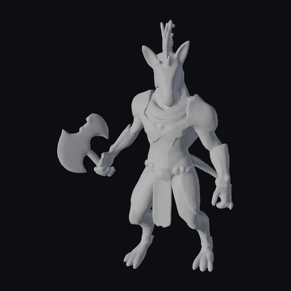 Standing proudly with a powerful stance, this zebra warrior boasts a striking appearance with its black and white stripes complemented by gold accents on its armor. The armor itself is a beautiful blend of African and futuristic elements, complete with a glowing blue crest on its head. Its right hand grips a large, battle-ready axe, while its left hand rests on its hip, suggesting a moment of calm before the storm. The intricate details on the armor and the textures of the zebra’s fur make this model a stunning addition to any fantasy or sci-fi project. Ideal for use in games, 3D printing, VR/AR experiences, animation, and design projects.