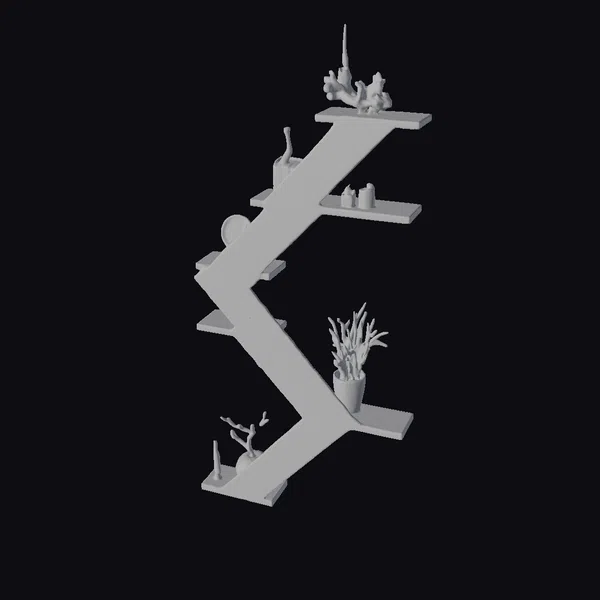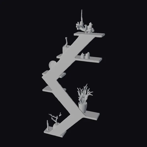The shelf’s frame is constructed from thick, dark wood, with each level protruding at alternating angles to create a dynamic, zigzag pattern. The surface of the wood has a smooth finish, reflecting light subtly and adding depth to the overall design. On the shelves, a curated selection of items is displayed: a potted plant with lush greenery sits on a lower shelf, while a decorative vase, a few small bottles, and an abstract sculpture adorn the upper shelves. The arrangement of these items not only showcases the shelf’s functionality but also its potential to elevate the aesthetic of any room. Whether for a game, 3D print, VR/AR experience, animation, or design project, this model offers a versatile and visually appealing element.