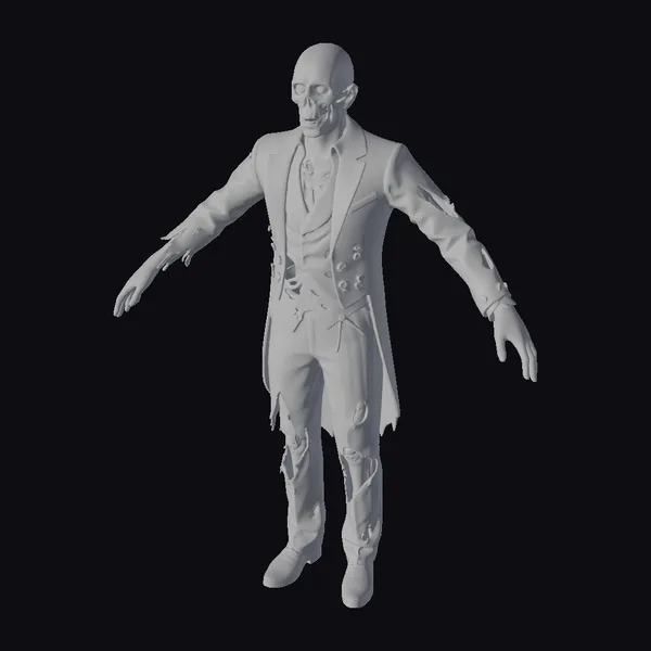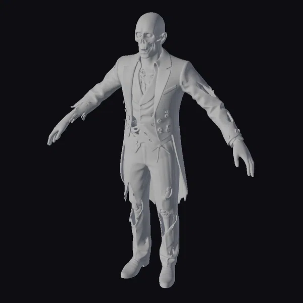 Standing with arms outstretched, this zombie businessman appears frozen in a perpetual state of decay. The suit, once a symbol of professionalism, now hangs in tatters, revealing glimpses of rotting flesh beneath. The realistic rendering showcases detailed textures, from the exposed bone to the frayed fabric. Ideal for projects requiring a touch of horror, this model is suited for games, animations, or VR/AR experiences that demand a realistic undead character. The high level of detail, especially in the face and hands, ensures a compelling and terrifying presence.