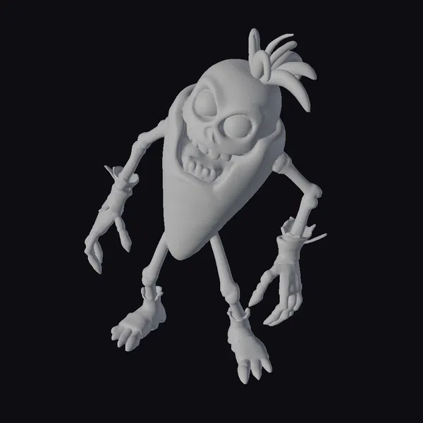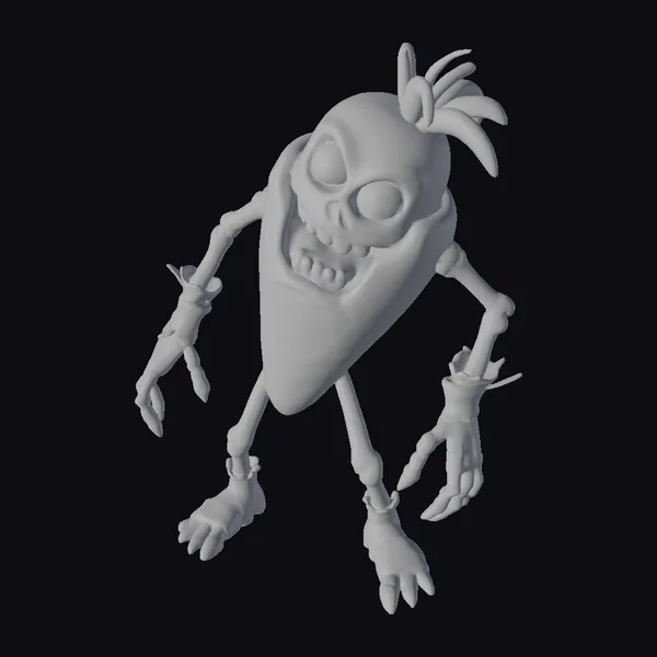 In a pose that seems to leap off the screen, this zombie carrot creature showcases intricate details such as textured skin, defined skeletal structure, and a menacing grin. The model’s vibrant orange hue contrasts with the stark white background, drawing attention to its unique features. The skeletal head, complete with black eye sockets and a toothy grin, adds a layer of macabre whimsy. This model is perfect for projects requiring a touch of dark humor, from animations and games to 3D printing and design. Its stylized appearance ensures it stands out in any scene.