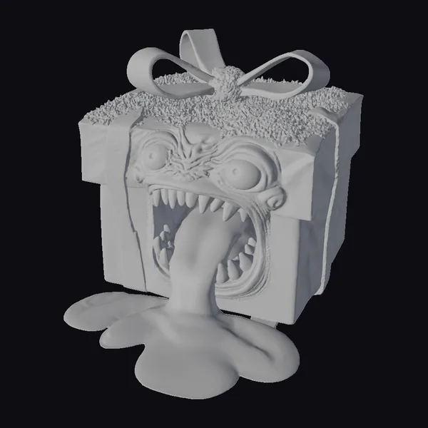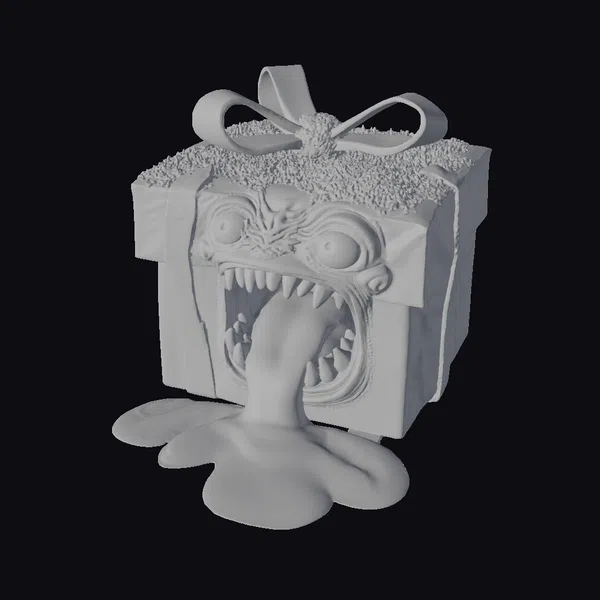 Detailed with a vibrant red and green Christmas wrapping adorned with snowflakes and trees, this gift box sits festively on a plain background. A large, slimy green tongue protrudes from the box’s gaping mouth, surrounded by sharp teeth and bulging eyes. The top is finished with a neatly tied red and gold bow, contrasting with the monster’s gruesome features. Ideal for adding a touch of dark humor to games, animations, or VR/AR experiences, this model brings a unique blend of holiday cheer and horror.