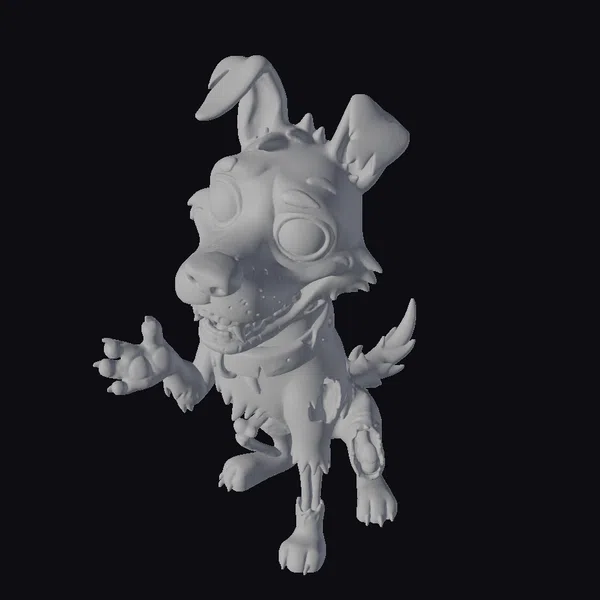 This zombie dog model boasts an intricate design, complete with a tattered red collar, glowing yellow eyes, and a mouth full of jagged teeth. Its cartoonish style adds a layer of whimsy to its undead appearance, making it perfect for projects that require a touch of dark humor. The model’s pose, with one paw raised and the other extended, gives it a sense of movement and energy. The level of detail is impressive, with visible wounds and exposed bones adding to the overall sense of realism. This model would be perfect for use in games, animations, or 3D prints, particularly around Halloween or for horror-themed projects.
