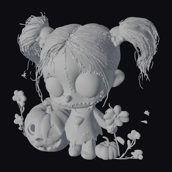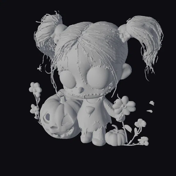 In a pose that is both endearing and unnerving, the zombie doll stands with her dark hair styled in messy pigtails, her face a canvas of gray and orange hues that suggest a blend of life and death. Her large, vacant eyes and stitched mouth lend an air of macabre whimsy. Clad in a black dress with vibrant pumpkin patterns, she holds a large jack-o’-lantern, its carved face a beacon of Halloween cheer. Smaller pumpkins and wilting orange flowers add to the autumnal and somewhat decayed ambiance. The doll’s design balances on the line between cute and creepy, making her a compelling addition to any 3D project, from animations and games to VR/AR experiences and 3D prints. Her unique blend of dark fantasy and playful elements invites a wide range of creative applications.