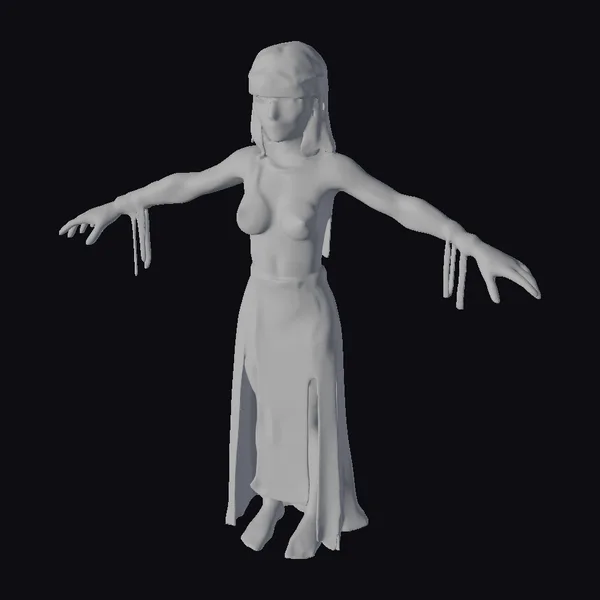 This gruesome 3D model depicts a zombie Egyptian queen in a T-pose, showcasing her terrifying form. Her long black hair is still adorned with a gold headband, while her body is covered in rotting flesh, bloodstains, and tattered remnants of her former royal attire. The queen’s white and gold skirt is now stained and torn, and her bare feet are covered in dirt and blood. Her arms are outstretched, as if beckoning victims to come closer. The model features intricate details, including golden jewelry, bandages, and clear gaps between her limbs and body. This model is perfect for horror-themed games, animations, or 3D printing projects.