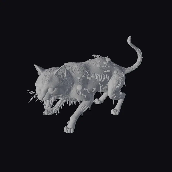 Detailed to perfection, this zombie cat 3D model captures the terrifying essence of a feline transformed into a creature of the undead. Its body is a mass of rotting green flesh, with patches of dark fur still visible beneath the decay. Glowing blue eyes pierce through the darkness, radiating an unnatural hunger. The model’s pose, with one paw extended forward and the tail arched behind, conveys a sense of dynamic movement, as if it’s about to pounce on its next victim. The texture work is highly detailed, with visible signs of decay and decomposition, including hanging strips of flesh and exposed bones. This model is perfect for use in horror-themed games, animations, or virtual reality experiences, where a chilling and realistic undead creature is needed.