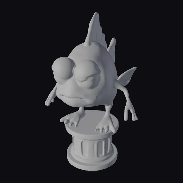 The zombie fish bust is posed on a simple pedestal, its bulging yellow eyes seeming to stare into the soul. The turquoise body is covered in darker blue spots and features vibrant orange fins and feet, which are webbed and clawed. The mouth is slightly agape, revealing small, pointed teeth. The entire model is rendered in a highly detailed, cartoonish style, with smooth textures and realistic lighting effects that bring out the colors and details. This model would be perfect for use in games, animation, or 3D printing, adding a touch of dark whimsy to any project.