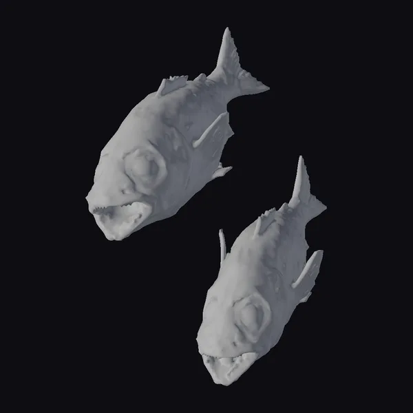 Detailed to perfection, these zombie fish are captured in mid-swim, their twisted bodies frozen in a perpetual dance. The duo boasts a mesmerizing color palette, with shades of gray, green, and hints of red, giving them an otherworldly glow. Their scales appear almost metallic, reflecting light and adding to their eerie presence. The eyes, a piercing white, seem to glow with an unnatural light, while their open mouths reveal rows of sharp teeth. Perfect for adding a touch of horror to games, 3D environments, or animations, these models are sure to leave a lasting impression.