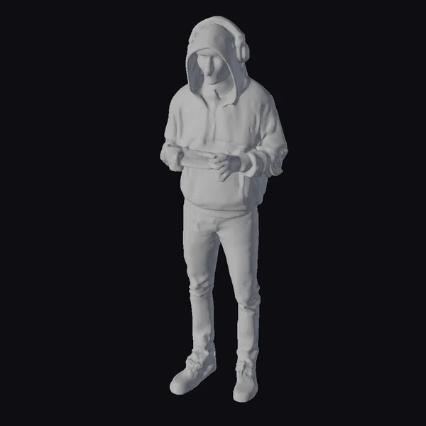 Standing tall with an unsettling presence, this zombie gamer figure is meticulously detailed, from the hoodie draped over its head to the blood-splattered jeans. The model’s face, a canvas of decay, features sunken eyes that seem to stare into the soul, complemented by a grayish complexion and a menacing mouth. The texture of the clothing, the sheen of the controller, and the subtle glow of the screen it’s interacting with are all captured with precision. This model is perfect for projects that merge gaming and horror, such as video game assets, animations, or virtual reality experiences.