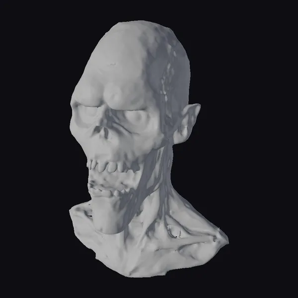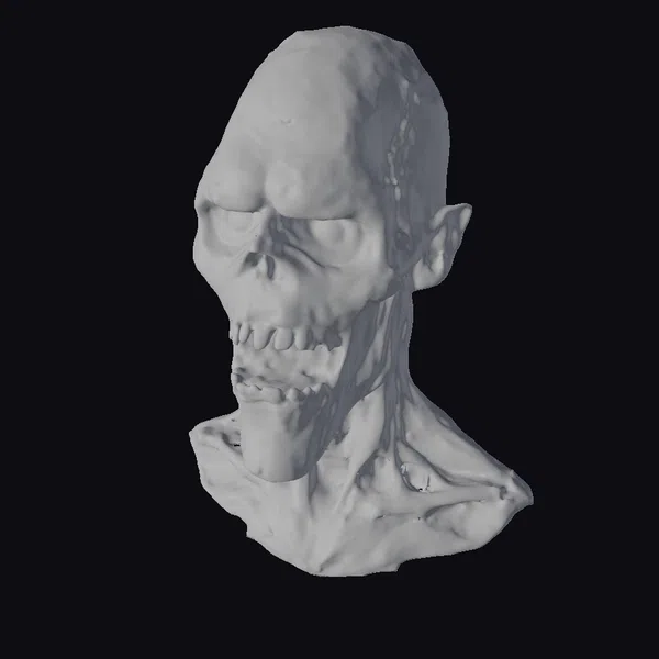 This highly detailed zombie head bust is a masterpiece of horror art. The undead creature’s face is a twisted grimace of rage and hunger, with glowing red eyes that seem to pierce through the darkness. The skin is a mass of dark veins, torn flesh, and exposed bone, with a texture that looks eerily realistic. The mouth is open, revealing jagged teeth stained with blood and gore. The overall effect is one of intense horror and dread, as if the zombie is about to lunge at you at any moment. This 3D model would be perfect for use in games, animation, or design projects that require a terrifying undead character.