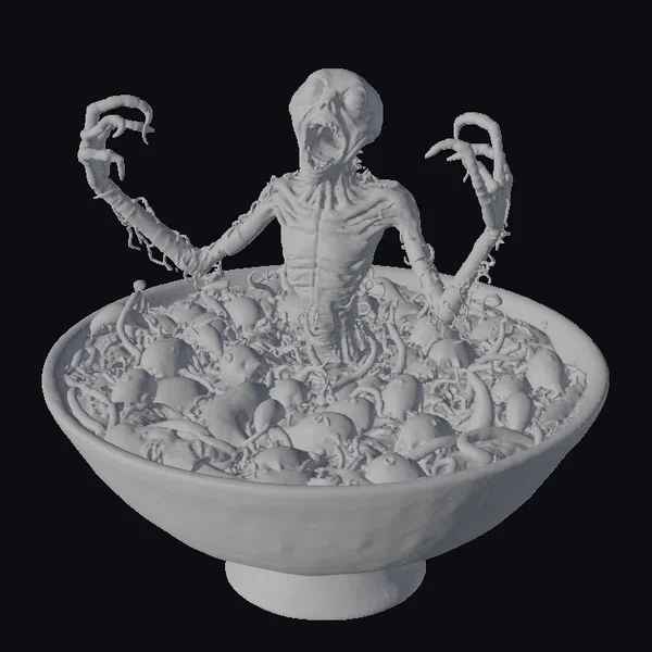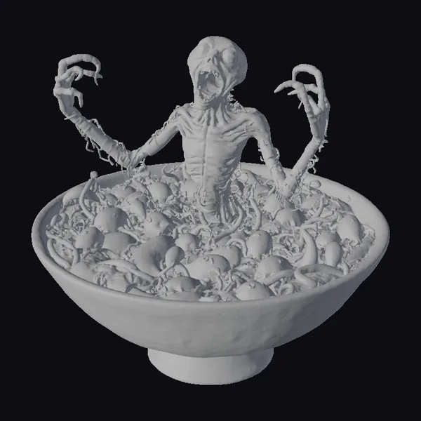 In a pose that seems to defy gravity and sanity, the zombie creature rises from a bowl filled with a viscous, blood-like substance, its skeletal frame contorted in a scream of rage or terror. The creature’s skin is a deep, mottled brown, with visible ribs and a gaunt face that seems to be pulled into a perpetual snarl. Its eyes glow with an eerie blue light, adding to the overall sense of dread and unease. The bowl itself appears to be stained and worn, as if it has been used for dark rituals or as a vessel for some ancient, malevolent power. This 3D model would be perfect for adding a touch of horror to any project, from video games to animations, or even architectural visualizations that require a touch of the macabre.