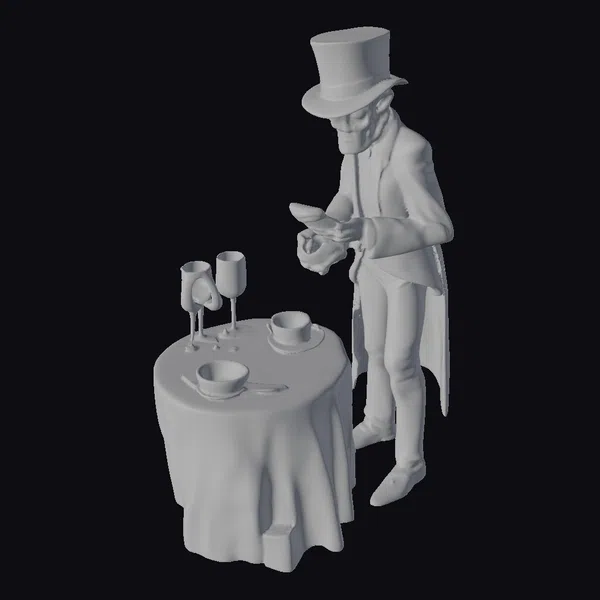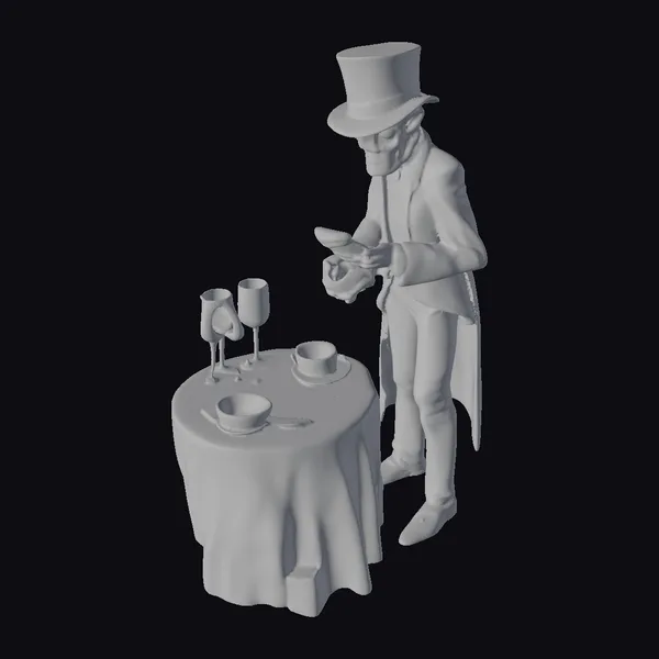 Standing tall in a dapper black tuxedo and a classic top hat, this stylized zombie exudes an air of sophistication as he bows at a round, elegantly set dinner table. The tablecloth is a pristine white, complemented by fine china, two wine glasses, and a teacup and saucer, all meticulously detailed. The zombie’s pose, with one hand on the table and the other holding a teacup, captures a moment of refined politeness. His green, decaying skin and sharp teeth offer a whimsical contrast to his dignified posture. This model is perfect for projects requiring a touch of dark humor or a unique character design, suitable for games, animations, VR/AR experiences, and design projects.