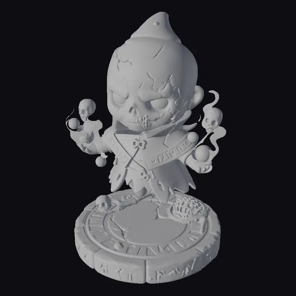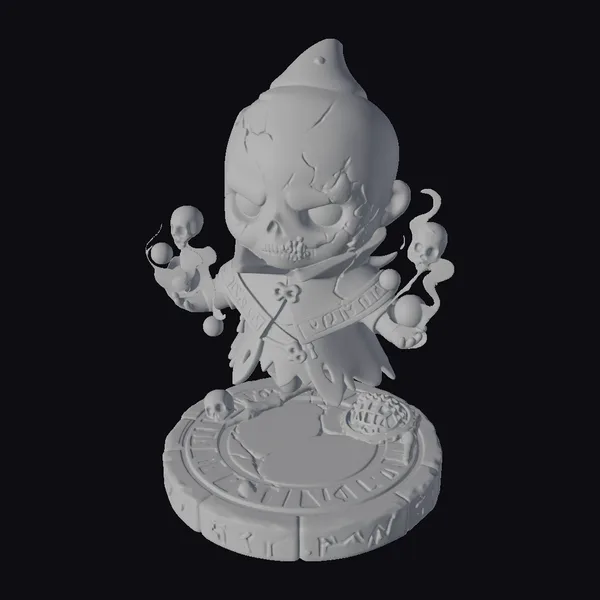 This zombie mage figurine stands with a commanding presence, its bald head a canvas of cracked, skull-like skin with deep purple veins. The eyes, a piercing blue, seem to hold a hint of magical power. Clad in a dark, tattered robe with a pointed hat, the mage grasps two glowing orbs that pulse with mystical energy. The base, a circular platform of stone-like material, features a green and purple design with embedded skulls and runes, adding to the mystical ambiance. Ideal for use in games, 3D printing projects, VR/AR experiences, animations, or as a unique decorative piece, this model is crafted with attention to detail, ensuring a high level of realism and appeal.