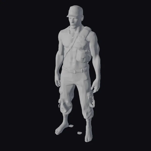 Standing in a slight A-pose, this highly detailed zombie military soldier exudes a sense of dread and horror. His green military uniform is torn and covered in bloodstains, with visible signs of decay and rot on his skin. The texture of his flesh is rough and decaying, with dark shadows accentuating the empty sockets of his eyes. The lighting highlights the gruesome details of his face and body, making him a perfect addition to any dark fantasy or horror scene. His gun and military gear add to the realism of the model, making it suitable for use in games, animation, or 3D printing.