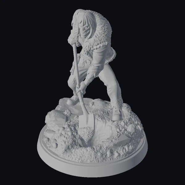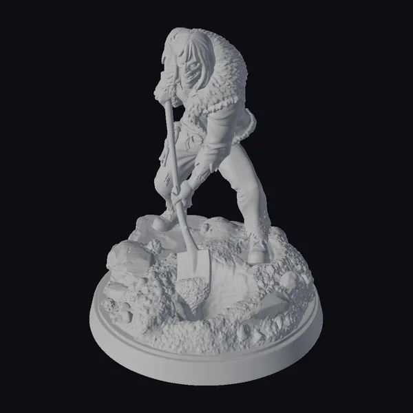 This meticulously crafted zombie miner figurine stands poised, as if caught in the act of digging into the night. The character’s face is painted with grayish-blue skin, complemented by reddish-brown hair and a menacing expression. The fur-lined hood adds a touch of ruggedness to the miner’s appearance, while the shovel, held firmly in the character’s hand, speaks to their profession. The base of the figurine is designed to resemble a dirt mound with rocks, enhancing the overall theme of a post-apocalyptic or dark fantasy setting. The model’s stylized yet detailed design makes it suitable for various applications, including games, 3D printing, virtual reality, animation, and design projects. The combination of horror and fantasy elements, along with the night shift theme, offers a unique aesthetic that can add depth and intrigue to any project.