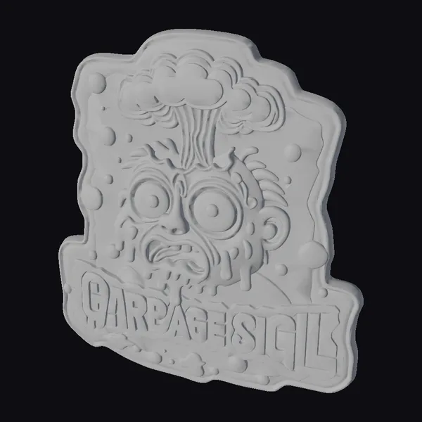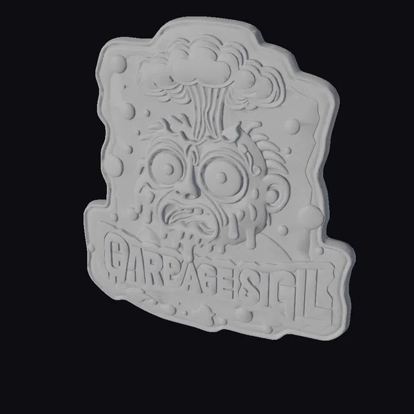 Detailed visual breakdown reveals a zombie head with a large, orange mushroom growing out of its skull, surrounded by pink and green goo. The zombie’s face is characterized by large, pink eyes with black pupils, a wide open mouth with visible teeth, and a comically exaggerated expression. The background features a pink and white splattered effect with brown spots, adding to the messy atmosphere. The ‘GARBAGE SIGII’ text is written in green letters with a black outline, contributing to the quirky feel. This model is perfect for use in games, 3D printing, VR/AR experiences, animation, and design projects that require a humorous horror element.