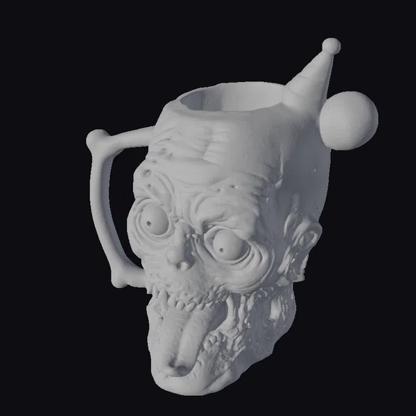 Detailed with a bulging eye and protruding tongue, this stylized zombie mug radiates a whimsical horror vibe. The addition of a multicolored party hat and a candy cane-striped handle elevates its festive appeal. Crafted with meticulous attention to detail, the mug showcases a textured, almost lifelike skin tone transition from orange to dark purple. Its application in design spans across game assets, 3D printing projects, virtual reality environments, and animation backgrounds. The unique blend of humor and horror makes it a standout piece for any Halloween or themed party setting.