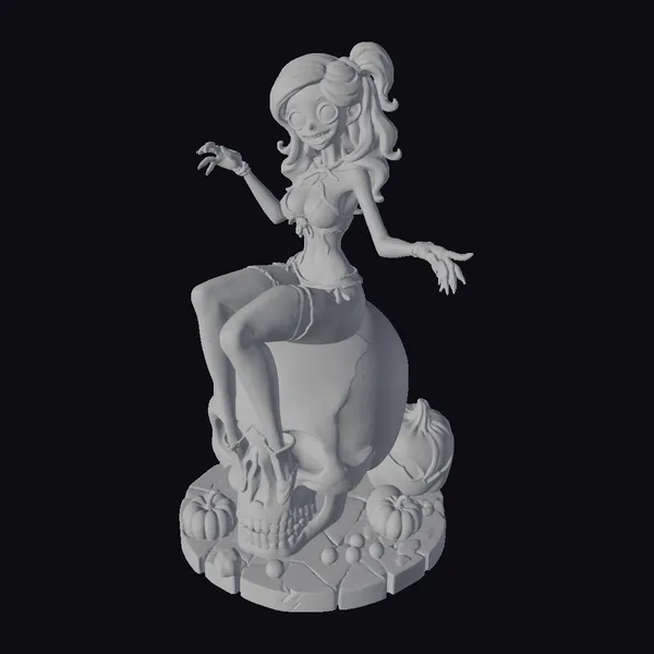 This meticulously crafted figurine showcases a zombie queen sitting regally on a grotesque pumpkin-skull hybrid, surrounded by smaller pumpkins and scattered candy. Her pose is dynamic, with one leg crossed over the other and arms outstretched, as if in a perpetual invitation or warning. The textures are rich and detailed, from the rough, cracked surface of the pumpkin to the smooth, decaying flesh of the zombie. The lighting accentuates her glowing eyes and the dark, bloody wounds on her body, creating a haunting atmosphere. This model is perfect for use in games, 3D printing, VR/AR experiences, animation, and design projects, especially those with a Halloween theme.