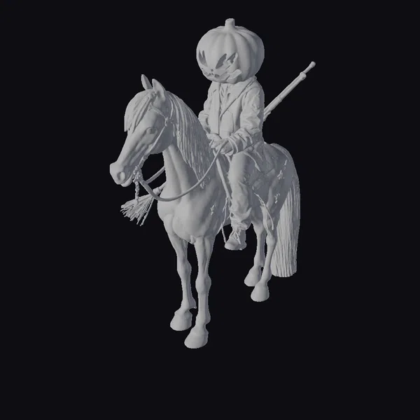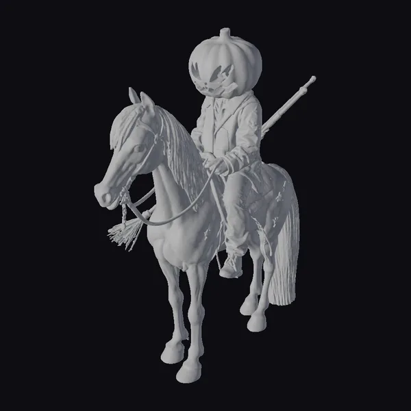 Imagine a hauntingly eerie scene come to life with this zombie rider perched atop a ghostly horse, both adorned with dark, tattered details and a pumpkin for a head, exuding an aura of spookiness perfect for your Halloween or dark fantasy projects.