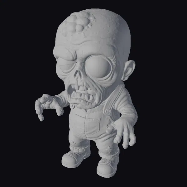 Standing with an unsettling posture, this zombie toy figure is meticulously detailed with a bulging eye, exposed teeth, and a gash on its forehead revealing red flesh underneath. The model’s skin is a pale green, with dark veins visible beneath the surface, adding to its undead appearance. Clad in blue overalls with a pocket on the front and red shoes that look like they’ve seen better days, this zombie exudes a sense of chaos. The figure’s pose, with arms outstretched and mouth open, captures a moment of aggressive movement, making it ideal for use in games, 3D printing, VR/AR experiences, animation, and design projects that require a touch of horror.