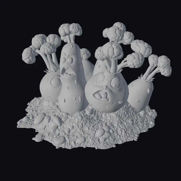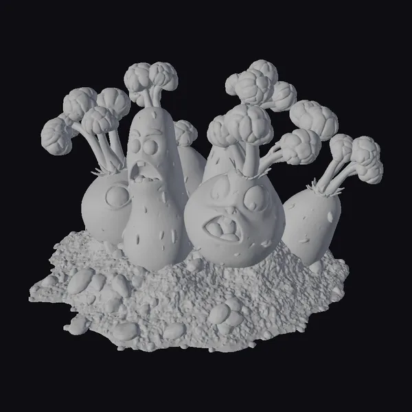 This group of zombie vegetables, complete with terrified expressions, emerges from the earth in a comically frightening display. The detailed textures show the decay and rot on their surfaces, while their broccoli-like green tops add a pop of color. The contrast between their natural and rotting parts creates a visually intriguing scene. Ideal for projects requiring a whimsical, horror-comedy vibe, such as animations, games, or promotional materials. Their unique blend of humor and horror can engage audiences and add a quirky touch to any project.