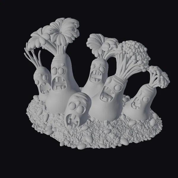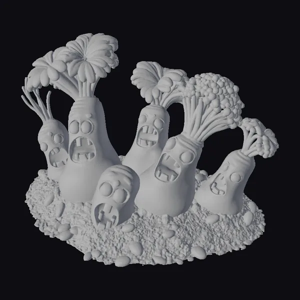 Imagine stumbling upon a garden where the vegetables have turned against their human cultivators. This 3D model features a cluster of seven zombie vegetables, including six carrots and one broccoli, emerging from a bed of dark brown soil scattered with green leaves and purple sprouts. Each vegetable has a unique, cartoonish design, with bulging eyes and open mouths, showcasing a range of expressions from shock to terror. The model is meticulously detailed, with textures that mimic real vegetables and a lighting effect that highlights their eerie, glowing eyes. The vibrant orange and green colors of the vegetables contrast with the dark soil, creating a visually striking image. This model is perfect for use in games, animations, or 3D prints, adding a touch of dark humor and whimsy to any project.