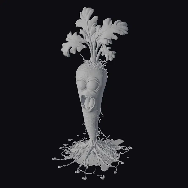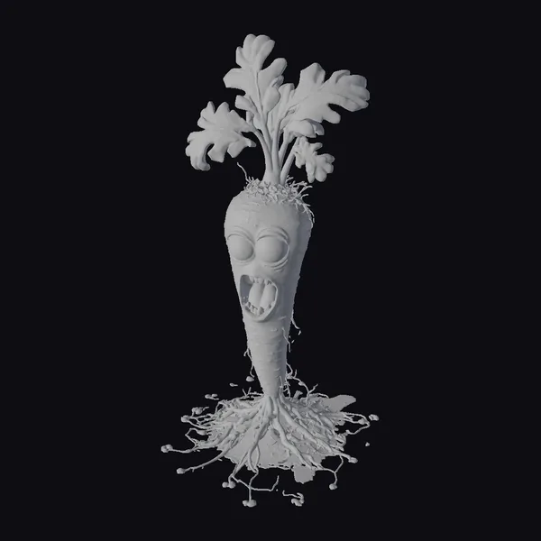 This uniquely terrifying yet whimsical zombie carrot plant 3D model is bursting out of the ground with a menacing yet playful demeanor. The model’s vibrant orange carrot body is topped with a green leafy crown, while its face showcases bulging white eyes, a wide-open mouth with jagged teeth, and dark, muddy smudges. The plant’s roots and dirt are intricately detailed, with soil clinging to its body and roots stretching out from its base. The contrast between the bright colors and the zombie’s gruesome features creates a captivating visual. Ideal for use in gaming environments, animations, or designs that require a quirky, attention-grabbing element.