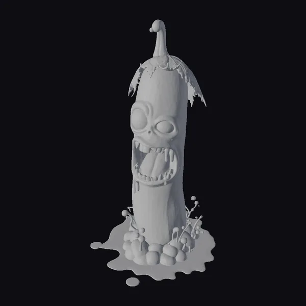 In a burst of mud and decay, this cartoonish zombie vegetable emerges, its body a vibrant mix of green and orange. The top of its vegetable form is crowned with twisted, leafy green shoots, while similar growths sprout around its base, adding to the chaotic scene. Its bulging white eyes with red centers stare wildly, and its mouth hangs open in a scream, revealing jagged teeth stained with blood and gore. The texture of its skin blends smooth surfaces with bumpy, organic growths, capturing a whimsical yet terrifying essence. This model excels in projects requiring a blend of humor and horror, such as animations, games, or VR experiences aiming for a quirky, stylized aesthetic.