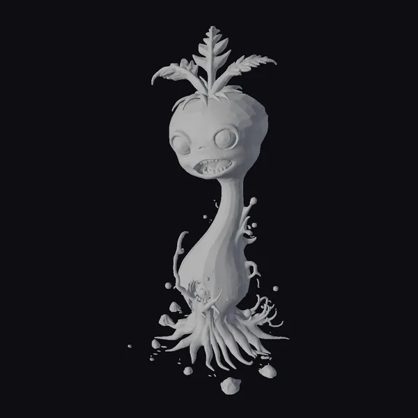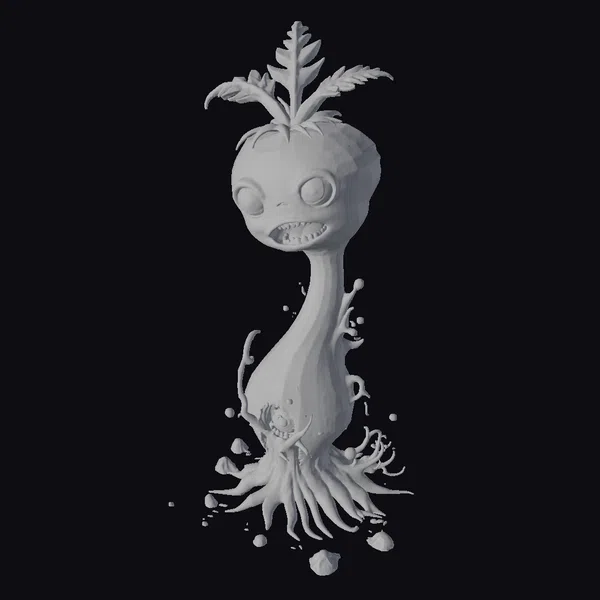 In a burst of dirt and decay, this cartoon zombie turnip rises from the depths, its bulging eyes glowing with an otherworldly light. The model’s texture blends smooth, green skin with rotting, brown decay, and a twisted, open mouth reveals jagged teeth. Green shoots sprout wildly from its head, adding a touch of whimsy to the horror. The roots of the turnip stretch out like gnarled fingers, as if grasping for its next victim. This model is perfect for adding a touch of dark humor to games, animations, or any project in need of a uniquely terrifying character.