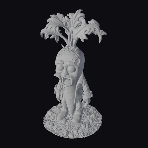 This vividly detailed model captures a zombie turnip in the midst of rising from the ground, its bulbous body covered in a mix of green and rotting flesh tones. The turnip’s face is contorted in a comically horrific expression, complete with bulging eyes and an open mouth revealing jagged teeth. A tattered green jacket and purple pants add to the character’s chaotic appearance. Surrounding the base, small rocks and dirt clumps enhance the scene. This model is perfect for use in games, animations, or as a quirky decorative piece, offering a unique blend of horror and humor.