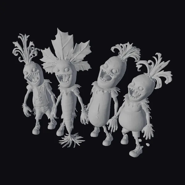 Each zombie vegetable is meticulously crafted with a level of detail that brings to life the eerie charm of these undead plant creatures. The two carrot-like figures stand tall, their orange hue illuminated by an otherworldly glow, while the potato-like entities to their right seem to embody a more grotesque transformation, their bulbous bodies and green shoots a stark contrast to the smooth, almost regal appearance of their carrot companions. The textures, ranging from the rough, earthy skin of the potatoes to the smoother, more vibrant carrots, are rich and inviting, begging to be explored in 3D. Whether you’re a game developer seeking unique characters, an animator looking for inspiration, or a 3D printing enthusiast eager to create something truly one-of-a-kind, these zombie vegetables are sure to captivate and inspire. Imagine them as centerpieces in a horror-themed game, as educational tools in an animation about the cycle of life and death, or as stunning pieces in a 3D printed diorama.