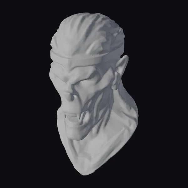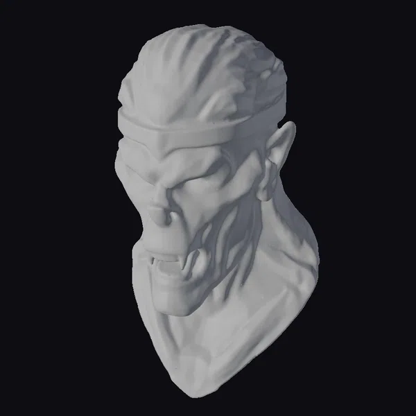 This zombie warrior bust is a masterpiece of dark fantasy, showcasing a grotesque undead creature with a menacing gaze. The model’s gray skin is weathered and worn, with a prominent forehead band made of metal, secured with rivets and adorned with a striking red stripe. The sharp teeth and sunken eyes contribute to its terrifying appearance. The bust’s pose and lighting accentuate its gruesome features, making it perfect for use in games, 3D printing, VR/AR experiences, animation, and design projects. Its level of detail and realism will undoubtedly leave a lasting impression.