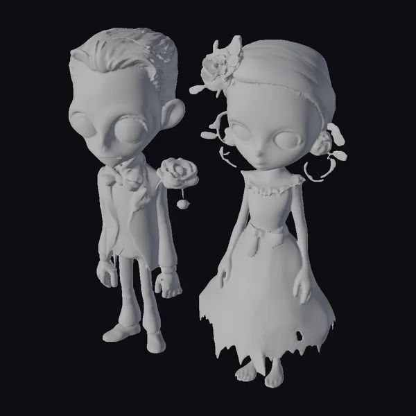Detailed with precision, this stylized zombie couple showcases intricate textures and a captivating pose. The groom sports a brown suit with a bow tie and a rose on his lapel, while the bride wears a flowing gown with a delicate bow and floral headpiece. Their eyes and skin tones are meticulously crafted to evoke a sense of undead whimsy. Ideal for use in animations, games, or as a unique decorative piece for Halloween-themed projects or haunted house designs.