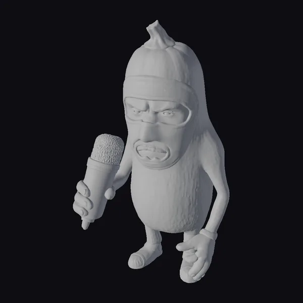 Detailed visual breakdown reveals a zucchini with a humanoid body, complete with green skin and darker green stripes, topped with a small stem. The purple ski mask covers its face, with purple splotches on its body adding a dynamic touch. Holding a black microphone with a gray mesh head, the zucchini’s green hands and black shoes complete its quirky appearance. Its pose suggests a serious news broadcast, making it perfect for animations, games, or designs needing a whimsical character. The model’s unique blend of humor and style can bring a fresh perspective to various projects, from children’s content to adult-oriented animations.