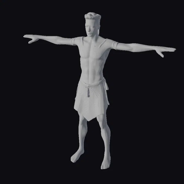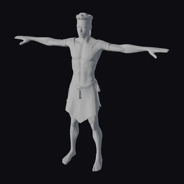 In a powerful T-pose, this high-poly 3D model showcases a Zulu male war doctor from the Shaka Zulu era. The model is barefoot and dressed in a traditional loincloth, with a headband and shell necklace adding to the authenticity of the ancient look. White body paint markings on the arms, legs, and torso enhance the model’s tribal appearance. The detailed skin texture and facial features bring a sense of realism to the model. The model’s pose, with arms outstretched and legs shoulder-width apart, conveys a sense of confidence and strength. This 3D model is perfect for use in historical or cultural projects, such as animations, games, or educational materials, where an authentic representation of ancient African culture is required.